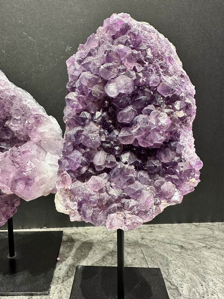 • Amethyst on a metal stand sourced from Uruguay and Brazil, showcasing unique purple hues perfect for decor or collection display.