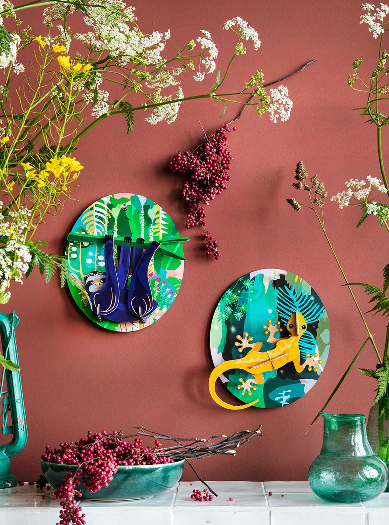 A dazzling array of flora and fauna are depicted amidst verdant palms and banana leaf plants. Toucan’s, Lovebirds, Parrots and Macaws fill the branches alongside jewel-toned serpents. Decorative butterflies, swinging monkeys and leopards in a scene of intricate splendour.