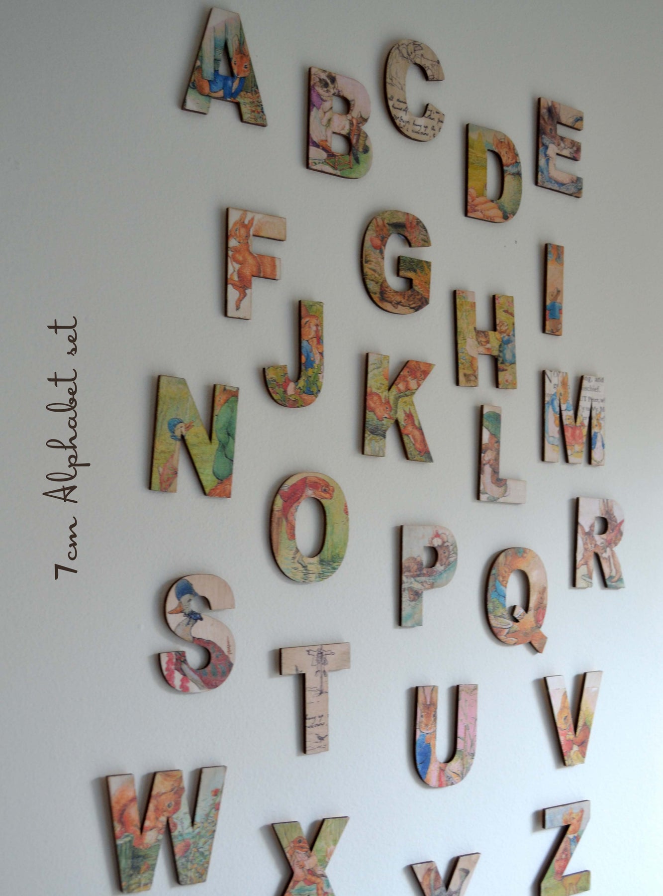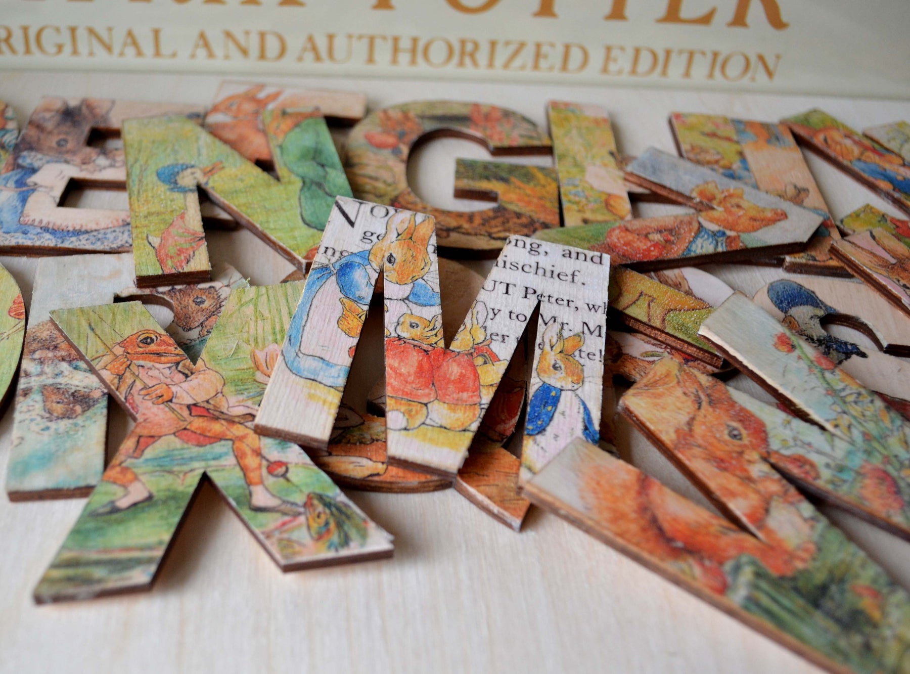 • Printing on Wood - These wooden letters are not découpage with storybook pages. We create each of our letters using a process that involves manually printing onto wood. Because this process is unpredictable and the image never transfers perfectly, each one we make have a unique set of subtle imperfections, that give the work a slightly distressed or aged look but also means that no two pieces are exactly alike so each letter is one of a kind!